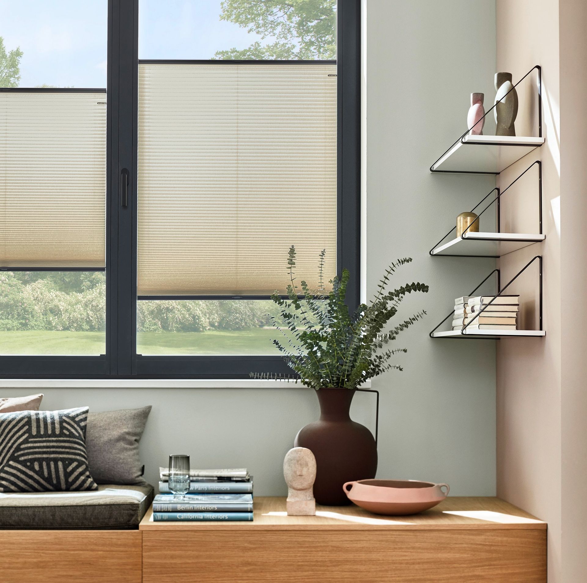 Das Duette® Wabenplissee sorgt nicht nur für blendfreie Lichtverhältnisse, sondern bietet auch hervorragenden Sichtschutz und eine spürbare Verbesserung der Raumakustik. Die Waben absorbieren Schall und tragen so zu einer angenehmeren Geräuschkulisse bei – ideal für Büros, Wohnräume oder Schlafzimmer.